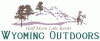| Script Half Moon Lake Resort Bold WYOMING OUTDOORS, our logo is a mountain wrapped in a river with a horse & rider on the right & three trees on the left. |