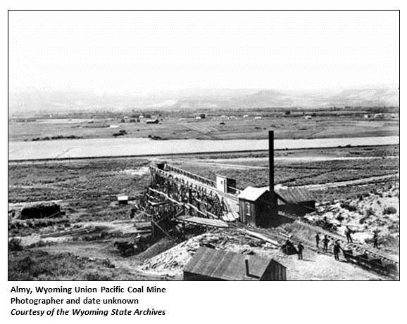 Mining camp named after James T. Almy, clerk to Simmons, first President of the Bear River Coal Company in 1869. The mine is rich in history of Chinese coal miners in the bituminous mines. (WPA) Named for James T. Almy (Annals of Wyoming 14:2) ... on the site by Thomas J. Almy, for whom the settlement which quickly sprung up was named. The Rocky Mountain Coal and Iron Company was organized by the Central Pacific Railroad Company and the Union Pacific opened mines. (Wyoming 75th Anniversary Commission)