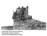 | This rock gave the name to Teapot Town which was named from the creek of this name and for the large rock formation bearing a marked resemblance to a teapot. About thirty six miles north of Casper, the town was started August 11, 1922. This is in the vicinity of the Teapot Dome and Naval Oil Reserve. (WPA) |