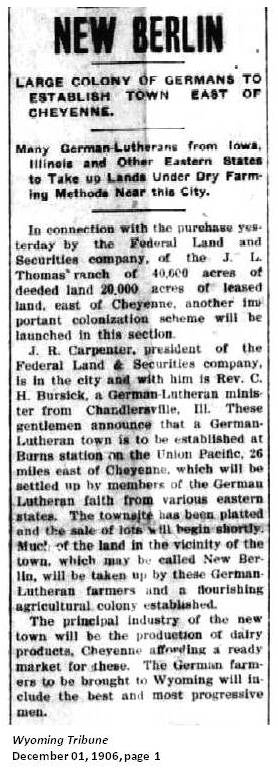 The Union Pacific Station at the location of Luther was established and known as Burns. When a town was established at the station, the initial proposal was to name it New Berlin, as it was to be established by people of the German Lutheran faith. It was named Luther and eventually became Burns. (WSL)