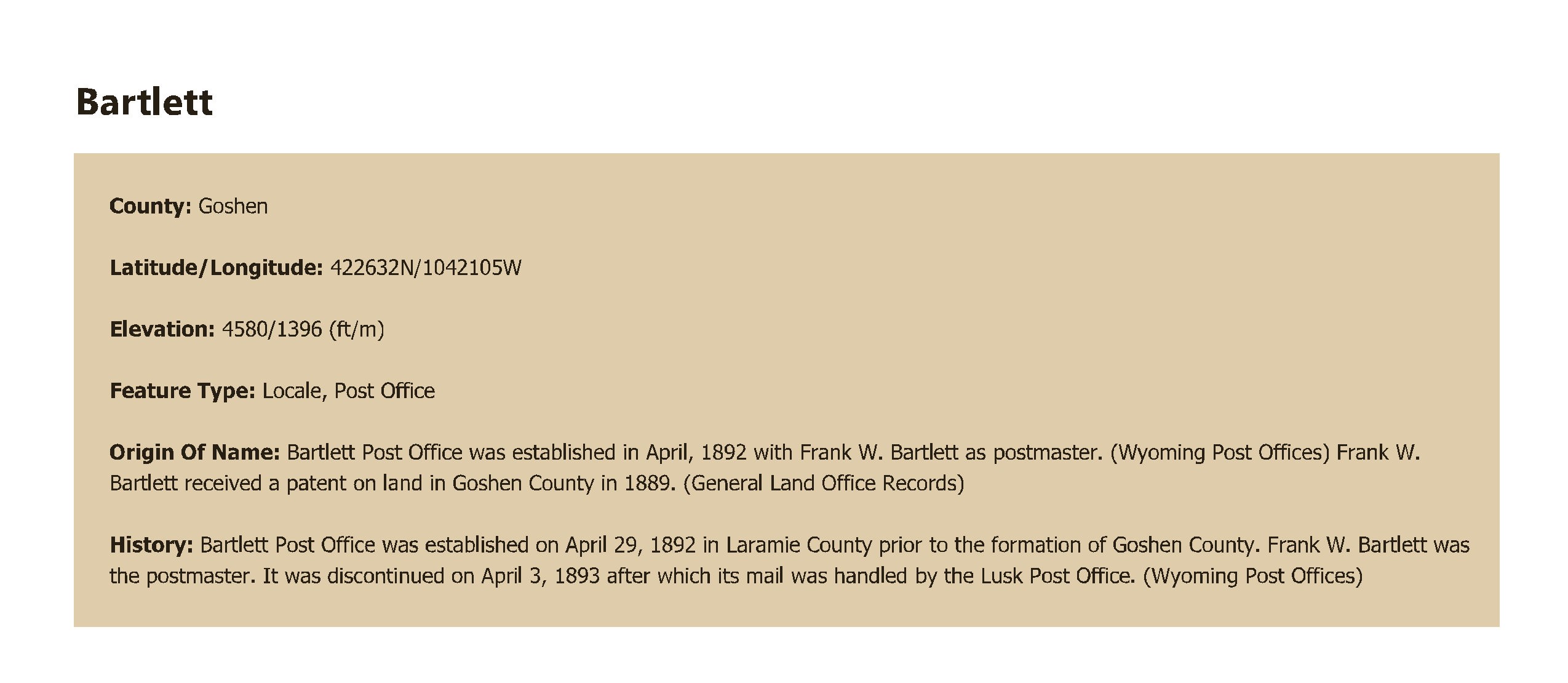 Bartlett Post Office was established in April, 1892 with Frank W. Bartlett as postmaster. (Wyoming Post Offices) Frank W. Bartlett received a patent on land in Goshen County in 1889. (General Land Office Records)