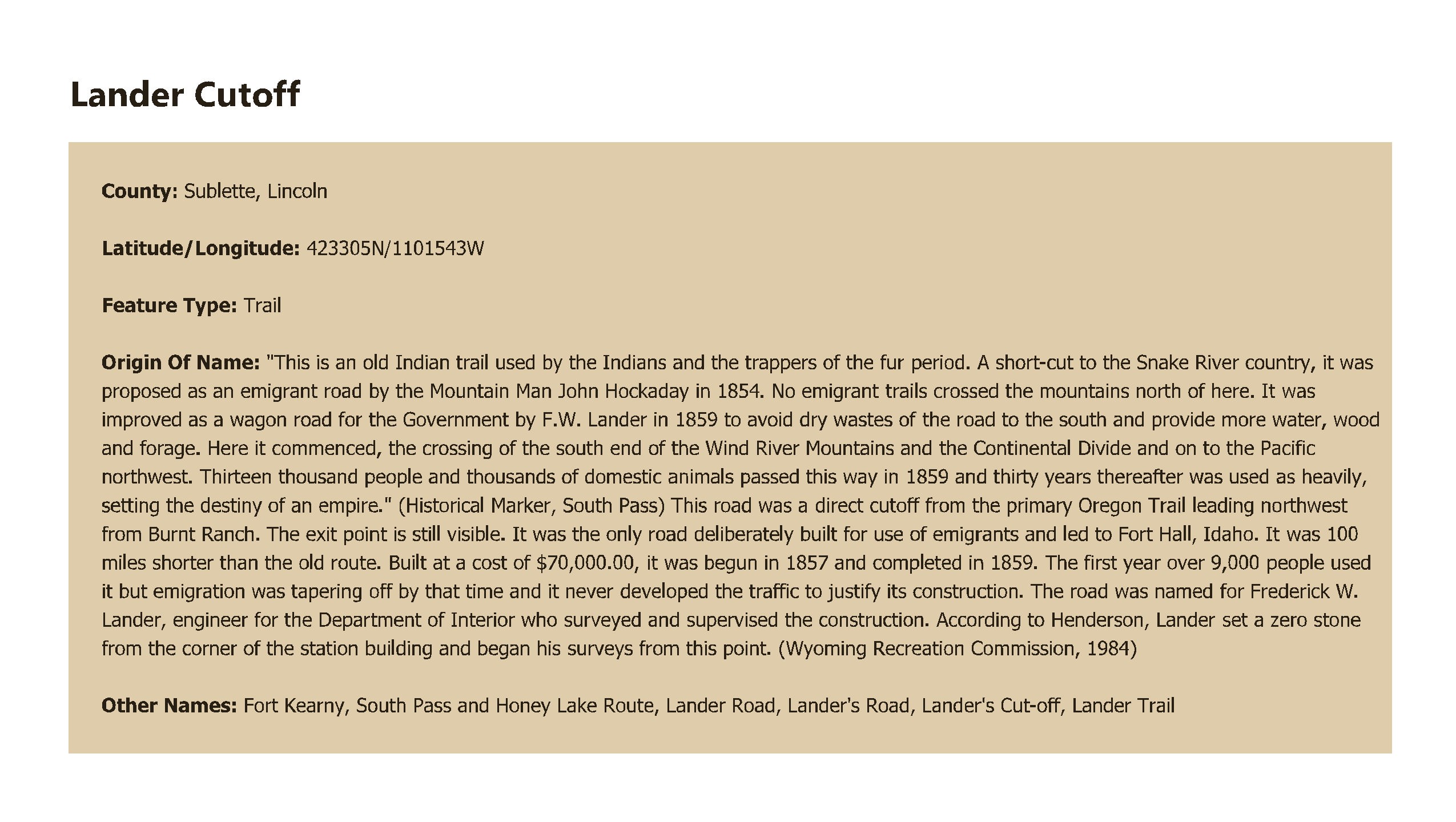 "This is an old Indian trail used by the Indians and the trappers of the fur period. A short-cut to the Snake River country, it was proposed as an emigrant road by the Mountain Man John Hockaday in 1854. No emigrant trails crossed the mountains north of here. It was improved as a wagon road for the Government by F.W. Lander in 1859 to avoid dry wastes of the road to the south and provide more water, wood and forage. Here it commenced, the crossing of the south end of the Wind River Mountains and the Continental Divide and on to the Pacific northwest. Thirteen thousand people and thousands of domestic animals passed this way in 1859 and thirty years thereafter was used as heavily, setting the destiny of an empire." (Historical Marker, South Pass) This road was a direct cutoff from the primary Oregon Trail leading northwest from Burnt Ranch. The exit point is still visible. It was the only road deliberately built for use of emigrants and led to Fort Hall, Idaho. It was 100 miles shorter than the old route. Built at a cost of $70,000.00, it was begun in 1857 and completed in 1859. The first year over 9,000 people used it but emigration was tapering off by that time and it never developed the traffic to justify its construction. The road was named for Frederick W. Lander, engineer for the Department of Interior who surveyed and supervised the construction. According to Henderson, Lander set a zero stone from the corner of the station building and began his surveys from this point. (Wyoming Recreation Commission, 1984)