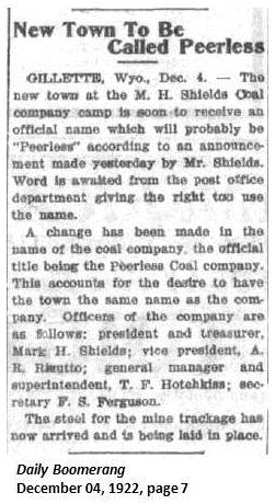 Location of the Peerless Coal Company. (Daily Boomerang December 04, 1922, page 7) "Townsite to be named Peerless" The Chicago and Burlington Railroad Station name is Peerless Siding. (Wyoming Post Offices)