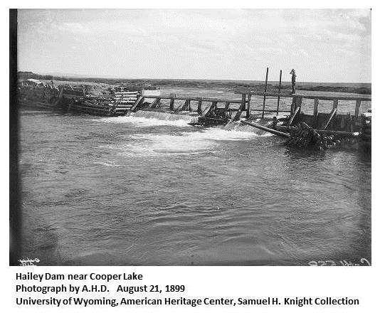 Near the station of Cooper Lake a small alkali lake surrounded with white incrustations of sodium carbonate is visible near the track, but Cooper Lake itself can be seen only from a point several miles west of the station. This lake is about 4 miles long and 2 miles wide and occupies the lowest part of a broad depression. Like many of the small lakes of the Laramie Basin it has no outlet, and the considerable quantities of water entering it through the two creeks that head in the Medicine Bow Mountains to the south escape only by evaporation. For this reason, the size of the lake is variable, depending on the balance between rainfall and evaporation. (Guidebook of the Western United States)