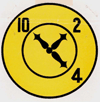| A clock dial design, consisting of two concentric circles and three equally sized clock hands. One points to the number 10, another points to 2, and the last hand points to the 4. |