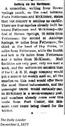 | "Brown Springs Creek and the springs at the base of a sandstone bluff nearby were named for Lieutenant John Brown, Company E, Eleventh Ohio Cavalry. Brown had been wounded near there on July 20, 1864 while pursuing the Indians who had captured emigrant Fanny Kelly. Brown died the next morning at the soldier's camp at the creek."(Diaries) |