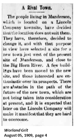 | In 1889, the Alamo post office was located here until the Burlington line reached the point and the Lincoln Land Company established Manderson. Manderson was named for an official of the Burlington railroad stationed in Omaha. This was the site of the first post office in Big Horn County. The town is near Nowood River, which comes in from the east, with the Big Horn River, running north. (WPA) Named for an Omaha official of the Burlington Railroad. (Annals of Wyoming 14:3) |