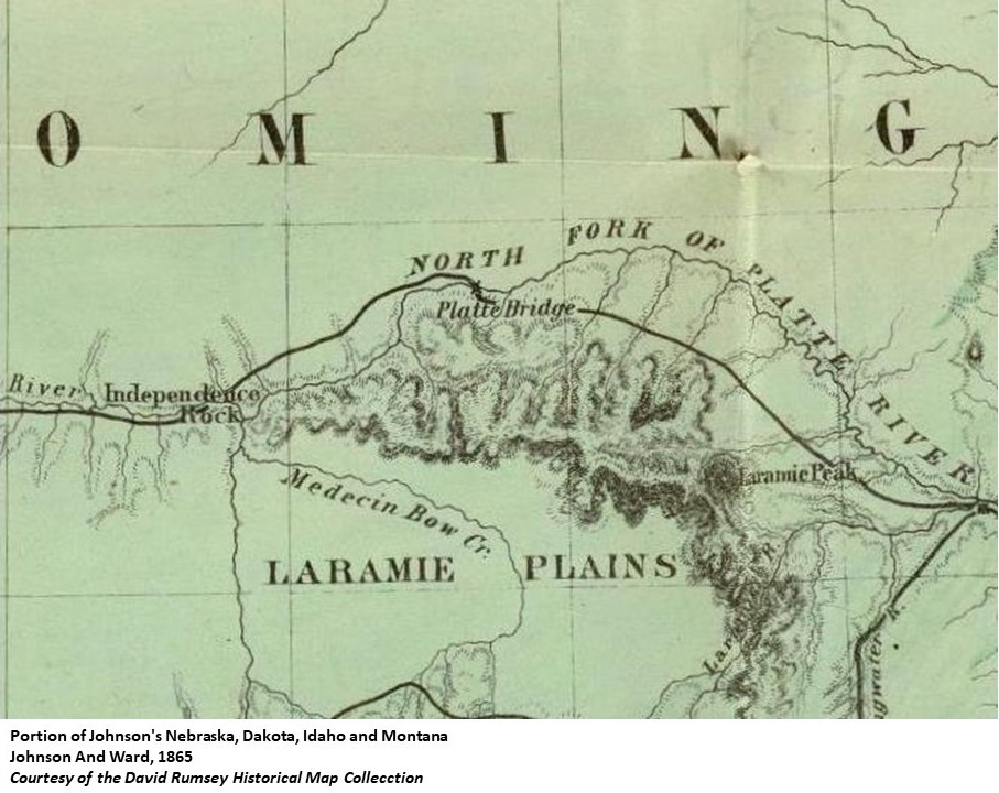 | It is an immense oblong of oval but irregular shape, along the southern base of which flow the river Sweetwater and along the northern base the Oregon Trail. It covers an area of over 27 acres and its highest point is 155 feet above the level of the river. The site of the rock became from the very first, a great camping place, and customs early arose of inscribing on it the names of travelers who passed it. More than 300,000 people crossed over what might be termed the eastern section before the advent of the Union Pacific Railroad in 1869, nearly all of whom stopped at the rock to rest and refresh themselves, to administer to the sick, to bury their dead, to rest their stock or to repair their equipment. It was thus, as Father DeSmet observed, "the great register of the desert." The name is of very early date, probably before 1830 or so, coming from the Ashley expeditions. The incident which gave rise to it is well known, from various references, which indicate that a party of hunters camped at the base of the rock on a Fourth of July and here celebrated the anniversary of the county's independence. Soon after the completion of the railroad, traffic was diverted and the Oregon Trail again, became a place of solitude. (WPA) The first mention I can find of this rock is by Rev. Samuel Park who visited it on the 7th of August, 1835. He, like Fremont, calls it Rock Independence. He says "This rock takes its name from the circumstance of a company of fur traders suspending their journey and here observing, in due form, the anniversary of our national freedom." I have talked with many old trappers and traders, and none of them are able to fix the date of the naming of this rock. Jim Baker tells me that Captain Bonneville named it, but of this he had no personal knowledge. The numerous names which Fremont found on the rock would indicate that it had long been known to white men. (Coutant) |