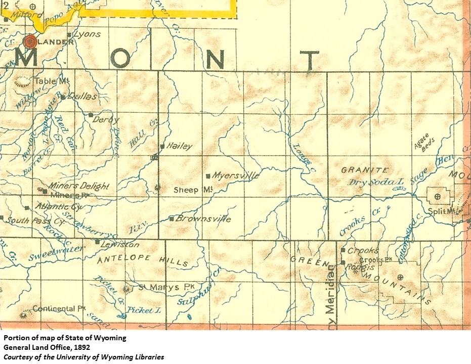 | A proposed name for the post office was Beaver as it was located on Beaver Creek. (Wyoming Post Offices) Hailey was a station on the Rawlins to Lander Stage Road. "The founder and first agent was Ora Hailey who worked for the Northwestern Mail and Transportation Company and was a prominent citizen in early day Fremont County." (Annals of Wyoming 47:2:241) |
