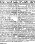 "The Powell Valley and the Alfalfa City" Powell Tribune September 8, 1911, Page 1; Farm town: stories of the early history of Powell. Bonner, Robert. [Powell, WY: Powell Tribune]. c1999.; Home in the valley : Powell's first century. Bonner, Robert. Cody, Wyo. : WordsWorth, c2008.; Pioneer memories : Powell, Park County, Wyoming. 2nd ed. Christiansen, Hazel. [Powell, Wyo. : Powell Business & Professional Women and Powell Branch AAUW], 1975.; My return to the Powell Valley. Clark, Doris C. Powell, Wyo. : Doris C. Clark, [1999]; Powell. Then & now Powell. Johnston, Jeremy M. Charleston, S.C. : Arcadia Pub., c2012.; Powell. Johnston, Jeremy M. Charleston, S. C. : Arcadia Pub., 2009. Powell, 1909-1959. Shanor, Don, ed.; Powell, Wyoming : Powell Jubilee Corp., 1959.; Walking tour of historic downtown Powell. Wyoming Historical Society. Park County Chapter. [Powell, Wyoming] Powell Valley Chamber of Commerce ca 1995.; Jeremy Johnston. Powell, Wyoming. WyoHistory.org