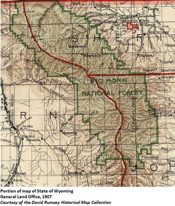 History of the Bighorn National Forest and the vicinity. Conner, James F. [S.l. : s.n.], 1940.; Multiple use in the Big Horns : the story of Bighorn National Forest. Murray, Robert A. Sheridan, Wyo. : [s.n.], 1980.; Bighorn National Forest, Wyoming : a land of wealth and wonder. United States. Forest Service. Washington, D.C. Forest Service, [193?].; Rediscovering the Big Horns : a pictorial study of 75 years of ecological change. Wyoming State Historical Society. [Wyoming? : Wyoming Historical Society], 1980.; Grover Cleveland: "Proclamation 393—Withdrawl of Lands for the Big Horn Forest Reserve, Wyoming," February 22, 1897. Online by Gerhard Peters and John T. Woolley, The American Presidency Project.; Theodore Roosevelt: "Proclamation 475—Enlargement of the Big Horn Forest Reserve," May 22, 1902. Online by Gerhard Peters and John T. Woolley, The American Presidency Project.
