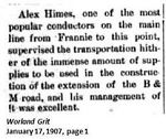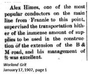 Himes Post Office in Big Horn County was established on July 22, 1908. It was named for the Burlington and Missouri Railroad station at the same location. The station was probably named for Alex Himes, who according to the Worland Grit of January 17, 1907, was one of the most popular conductors on the line. (WSL)