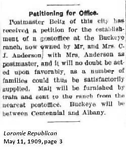 | Buckeye Post Office was established on the Buckeye Ranch. (Laramie Republican May 11, 1909, page 3) "Probably the best known among the older ranches of the Centennial Valley is the Buckeye Ranch owned, in the early days, by the Dole Brothers who operated under the name of the Albany Land and Cattle Company. ... About 1880 the Dole Brothers came out from Ohio and purchased the ranch and they were the first ones to make extensive water developments on the ranch, ... The name Buckeye was taken from the nickname of the Dole Brothers' home state, Ohio." (Burns) |
