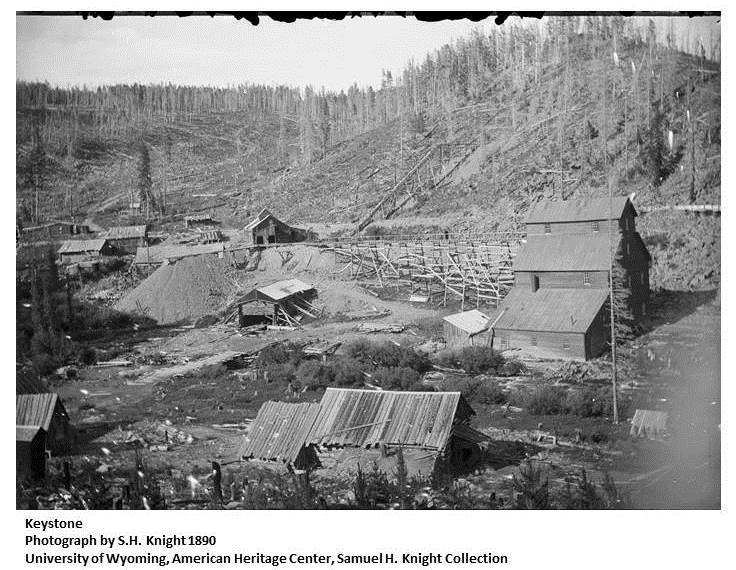 Mine owned by Colonel Downey, 1878. Located on Douglas Creek southwest of Centennial and operated by Keystone Mining Company, from which the town takes its name. (WPA)