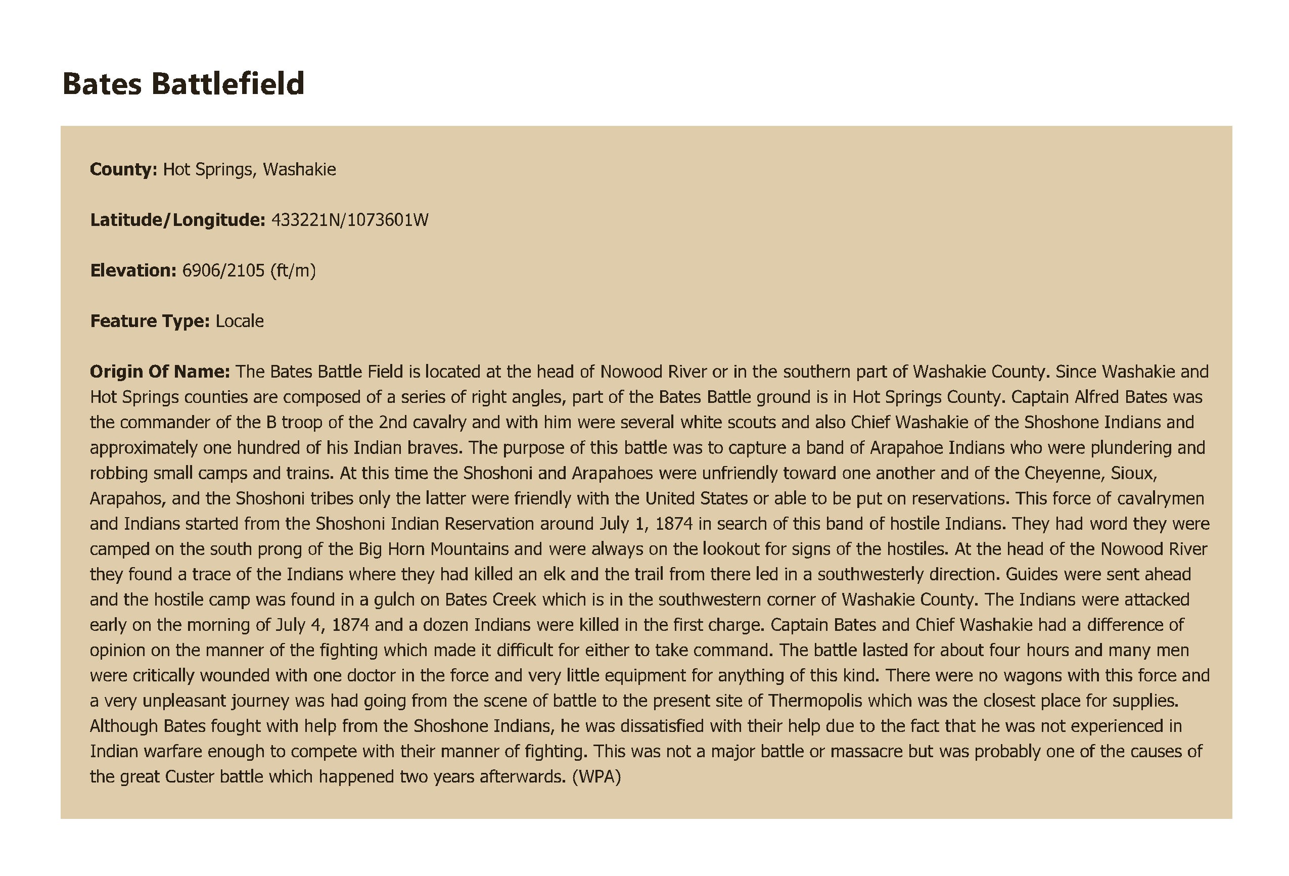 | The Bates Battle Field is located at the head of Nowood River or in the southern part of Washakie County. Since Washakie and Hot Springs counties are composed of a series of right angles, part of the Bates Battle ground is in Hot Springs County. Captain Alfred Bates was the commander of the B troop of the 2nd cavalry and with him were several white scouts and also Chief Washakie of the Shoshone Indians and approximately one hundred of his Indian braves. The purpose of this battle was to capture a band of Arapahoe Indians who were plundering and robbing small camps and trains. At this time the Shoshoni and Arapahoes were unfriendly toward one another and of the Cheyenne, Sioux, Arapahos, and the Shoshoni tribes only the latter were friendly with the United States or able to be put on reservations. This force of cavalrymen and Indians started from the Shoshoni Indian Reservation around July 1, 1874 in search of this band of hostile Indians. They had word they were camped on the south prong of the Big Horn Mountains and were always on the lookout for signs of the hostiles. At the head of the Nowood River they found a trace of the Indians where they had killed an elk and the trail from there led in a southwesterly direction. Guides were sent ahead and the hostile camp was found in a gulch on Bates Creek which is in the southwestern corner of Washakie County. The Indians were attacked early on the morning of July 4, 1874 and a dozen Indians were killed in the first charge. Captain Bates and Chief Washakie had a difference of opinion on the manner of the fighting which made it difficult for either to take command. The battle lasted for about four hours and many men were critically wounded with one doctor in the force and very little equipment for anything of this kind. There were no wagons with this force and a very unpleasant journey was had going from the scene of battle to the present site of Thermopolis which was the closest place for supplies. Although Bates fought with help from the Shoshone Indians, he was dissatisfied with their help due to the fact that he was not experienced in Indian warfare enough to compete with their manner of fighting. This was not a major battle or massacre but was probably one of the causes of the great Custer Massacre which happened two years afterwards. (WPA) |