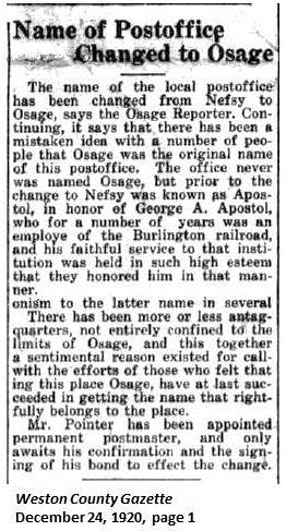 Named for George A. Apostol, an employee of the Burlington Railroad. (Weston County Gazette December 24, 1920, page 1)