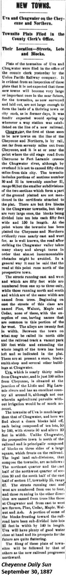 | Named for an early brand. (Annals of Wyoming 15:1) The name Uva, meaning wild grapes or grape vine in Spanish, is said to have been used for the little settlement at the mouth of the North Laramie River because of the wild grapes that grow profusely along the Laramie River. Another theory attributes the name to an old brand. Whatever the origin of the name, Uva did not exist as a town until it became a railroad terminal in 1887. Wheatland was a vast prairie at that time, and it was generally believed that Uva would be headquarters. (Trenholm) |