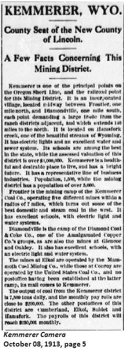 | Named after M. S. Kemmerer who was a New York capitalist. He became interested in the coal mines and the mines and the town were named after him. (WPA) In 1897, P.J. Quealy, coal inspector for Wyoming, recognized the value of coal veins being opened near Diamondville. He obtained the backing of Mahlon S. Kemmerer of Mauch Chunk, Pennsylvania, and organized a mining company here. (Annals of Wyoming 14:3) |
