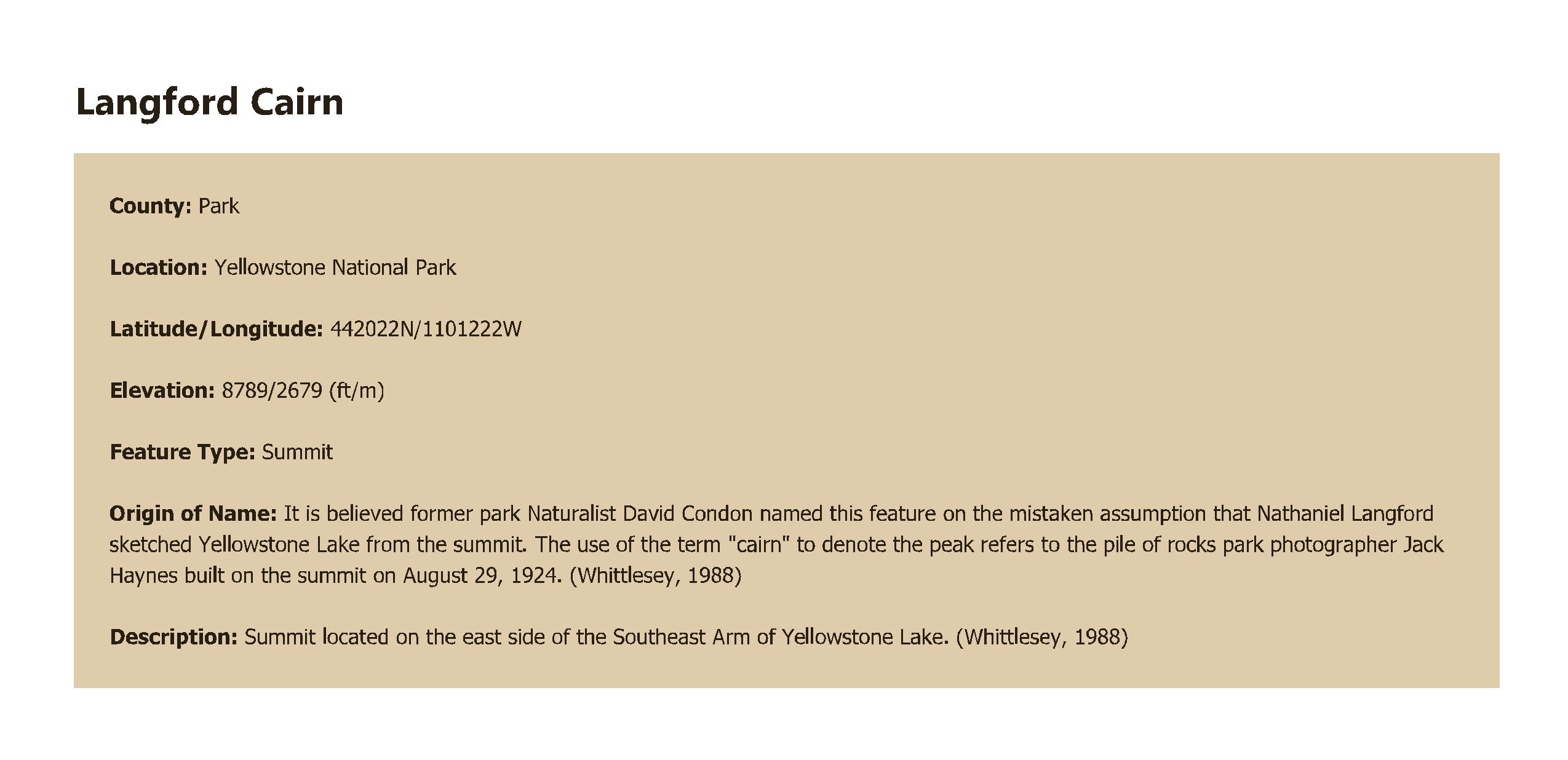 | It is believed former park Naturalist David Condon named this feature on the mistaken assumption that Nathaniel Langford sketched Yellowstone Lake from the summit. The use of the term "cairn" to denote the peak refers to the pile of rocks park photographer Jack Haynes built on the summit on August 29, 1924. (Whittlesey, 1988) |