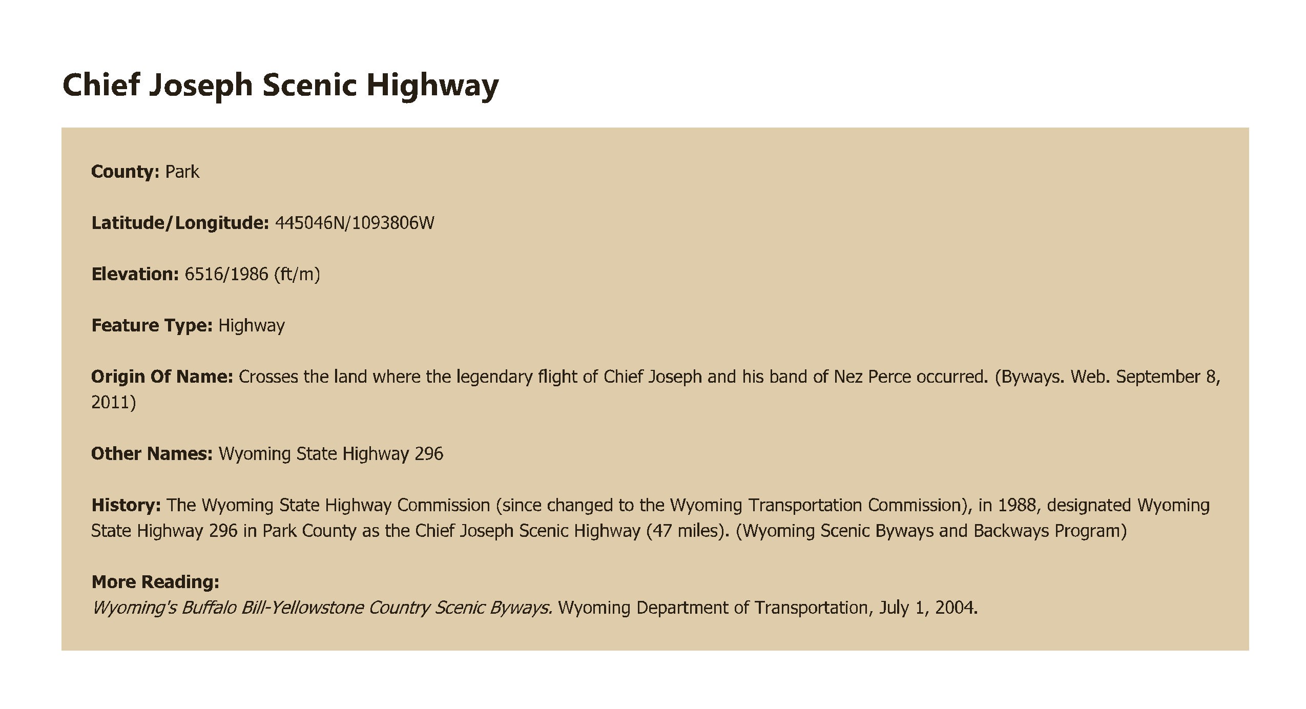 | Wyoming's Buffalo Bill-Yellowstone Country Scenic Byways. Wyoming Department of Transportation, July 1, 2004. |
