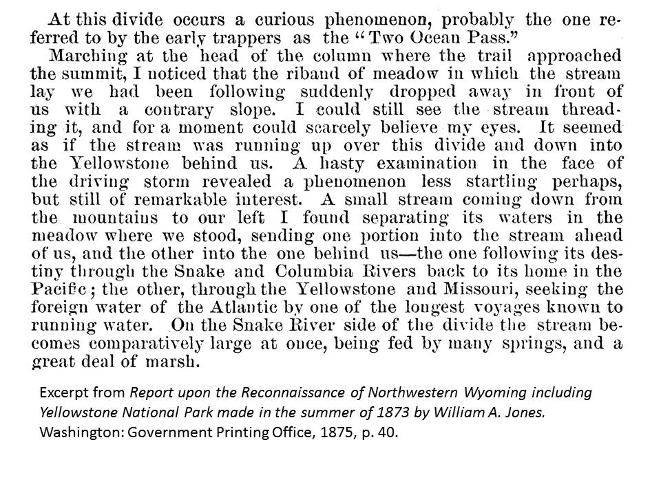| Described by Jim Bridger in the early 1830's as the place where a stream comes from the north and divides in the canyon, one flowing to the Atlantic seaboard and the other to the Pacific. (WPA) The timbered Continental Divide, which comes down in a southeasterly direction from Yellowstone Park, arches here toward the west to form a three-way watershed. Streams from these mountains eventually join the Columbia, Colorado, and Missouri Rivers. Pacific Creek heads near the summit of the range and flows westward to join the Columbia. Atlantic Creek, which joins the Missouri system, heads in the same swamp at Two Oceans Pass, about 25 miles northeast. (Wyoming Guide) During the summer of 1873, Captain William A. Jones and party explored northwestern Wyoming and Yellowstone.On September 3, the reached Two Ocean Pass. (Jones) |