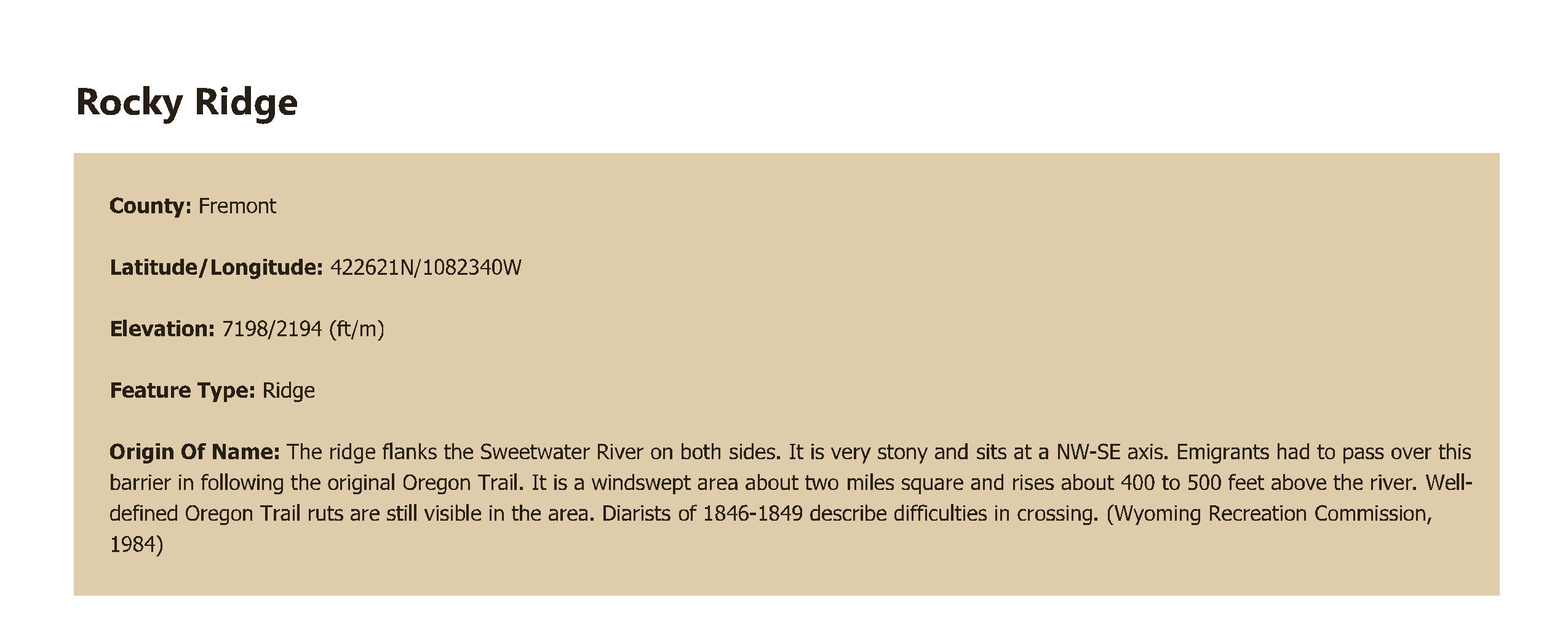 | The ridge flanks the Sweetwater River on both sides. It is very stony and sits at a NW-SE axis. Emigrants had to pass over this barrier in following the original Oregon Trail. It is a windswept area about two miles square and rises about 400 to 500 feet above the river. Well-defined Oregon Trail ruts are still visible in the area. Diarists of 1846-1849 describe difficulties in crossing. (Wyoming Recreation Commission, 1984) |