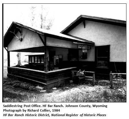 | Saddlestring is actually the H.F. Bar Ranch, a big dude ranch as well as a regular cattle ranch. When there was a need to establish a post office there, the postal service wouldn't accept H.F. Bar as the name but suggested several others including "Saddlestring." The founder and owner of the ranch chose it because so many dudes (inexperienced riders) hold on to the saddlestrings of a saddle to keep from bouncing. (Christiansen) |