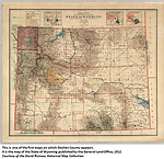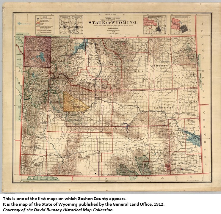 Named for Goshen Hole, a basin in the area which is to the south of a range of hills along the North Platte River. Originally known as Gosche's Hole, from the name of a French trapper who settled in that locality, it was corrupted into Goshen, Biblical "land of plenty," by early pioneers, probably on account of vast stretches of native hay, indigenous to the area, on which great herds of antelope grazed. Organized in 1911. County seat is in Torrington. (WPA) Goshen County, with Torrington as its county seat, was formed in 1911, and while it no doubt was named with the Biblical "Land of Goshen" in mind, historians disregard the fact that Goshen Hole was "Goche's Hole" almost a century ago. This large depression, named for the Assiniboine chief Goche, Gauche, or Gaucher was far from "a land of plenty" when Parkman passed through there in 1846 after completing his stay in the Fort Laramie vicinity. He describes it as "a wide sterile basin." (Trenholm)