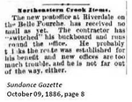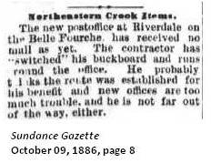 Located on the Belle Fourche River. (Sundance Gazette October 09, 1886, page 8) Other proposed names for the post office were Belle Fourche, Clyde, Glendale, and Lockwood. (Wyoming Post Offices)