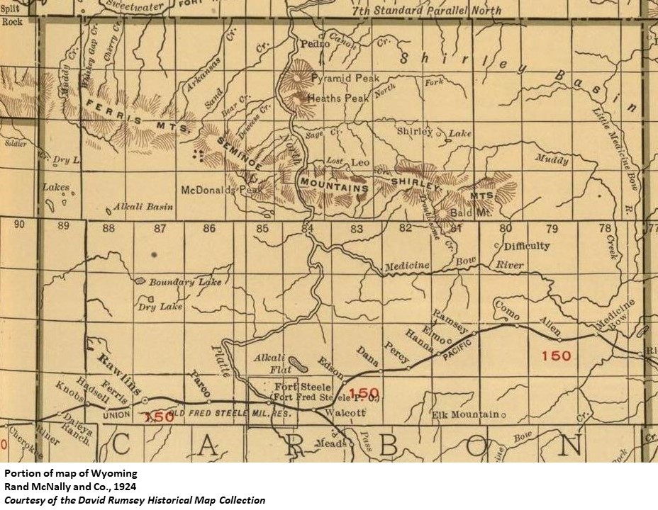 | The town of Fort Steele derives its name from Fort Fred Steele, an army post established here in 1866 to guard the Union Pacific Railroad against Indians. At the time of the Meeker massacre, in the early eighties, it was from Fort Fred Steele that the unfortunate force commanded by Major Thornburg was sent to put down the uprising. Major Thornburg and most of his command never returned. That any of them survived was due to the dispatch of a second expedition from the fort to their relief. There is little about the town now to suggest the troubled Indian times. It serves as a place of supply for sheep herders and for the farms scattered up and down North Platte River wherever the valley is wide enough to be cultivated. The North Platte, from which the railroad diverged at the city of North Platte, 291 miles west of Omaha, is reached again at Fort Steele, 384 miles west of North Platte and 3,705 feet higher. To the left (south) as the train crosses the bridge over the North Platte at Fort Steele may be seen a sawmill which works timber cut in the mountains and floated down the river. This mill produces many railroad ties and mine props from timber grown in the Medicine Bow and Hayden National Forests. (Guidebook of the Western United States) |