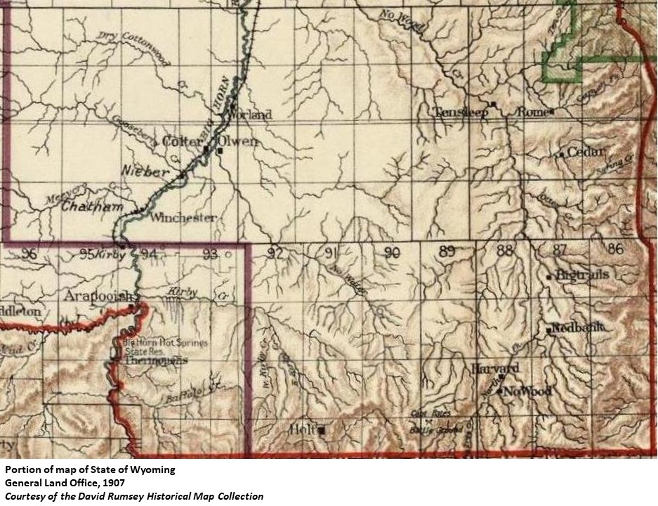 | The town of Winchester, like most other early towns, was settled with the idea of farming the near vicinity. R.S. Winchester first settled in this spot, so for this reason the Burlington Railroad Company, which was establishing towns along their route, named it Winchester. R.S. Winchester was known for his Civil War service. (WPA) Winchester was named for the first postmaster, R. S. Winchester. When the railroad built through, the postmaster objected to having his name on the boxcar that served as a station, and the station was named Chatham. (Wyoming Guide) Winchester Post Office was established in May, 1903 with Russell A. Winchester as its first postmaster. (Wyoming Post Offices) |