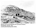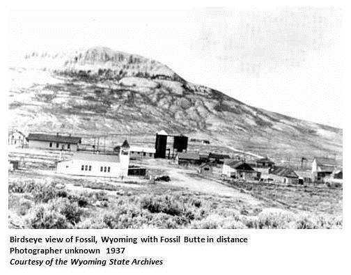 | Fossil, a little hamlet in Lincoln County, is about fifteen miles west of Kemmerer. It was named from the district in which it is located, the famous fossil field of Lincoln County. In the late 1870's this fossil field was discovered by Jesse and John Bell, two trappers. E. W. Holland, one of the first settlers in the fossil field country, first dug and marketed the fossils. Fossils of fish that resemble the herring, bass, pickerel, and sunfish of present day are found in the rock formations of the fossil field. Both fresh and salt water fish are found. The explanation most frequently given is that all of these must have been salt water fish at one time. It is well known, of course, that the locality was once part of the ocean bed. Fossils of insects, palm leaves, berries, queer birds, crawfish, snakes, and garfish have been found in this area. (WPA) Named for the nearby Fossil Cliffs which contain fossil fish beds. (Annals of Wyoming 14:3) |