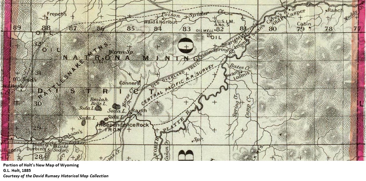 | Located on the ranch of the Searight Brothers. " ... the Searight Brothers ... drove in 14,000 head of cattle from Texas to Casper Creek in 1877. They comprised the group that built the famous old stone ranch house near the Platte River which is remembered as the Goose Egg Ranch." (Annals of Wyoming 24:1) |