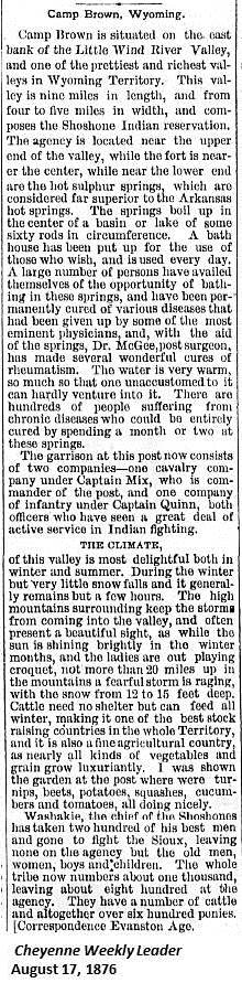 Established by the federal government in 1869 as Camp Augur. Name changed to Camp Brown. Renamed Fort Washakie in 1878 for Chief Washakie of the Shoshone tribe. A government post until 1907, it is now headquarters for the offices of the United States Indian Services on the Wind River Indian Reservation. (WPA) Formerly Camp Augur. Renamed on March 28, 1870, in honor of a young lieutenant killed in the Fetterman Massacre. (Annals of Wyoming 14:3)