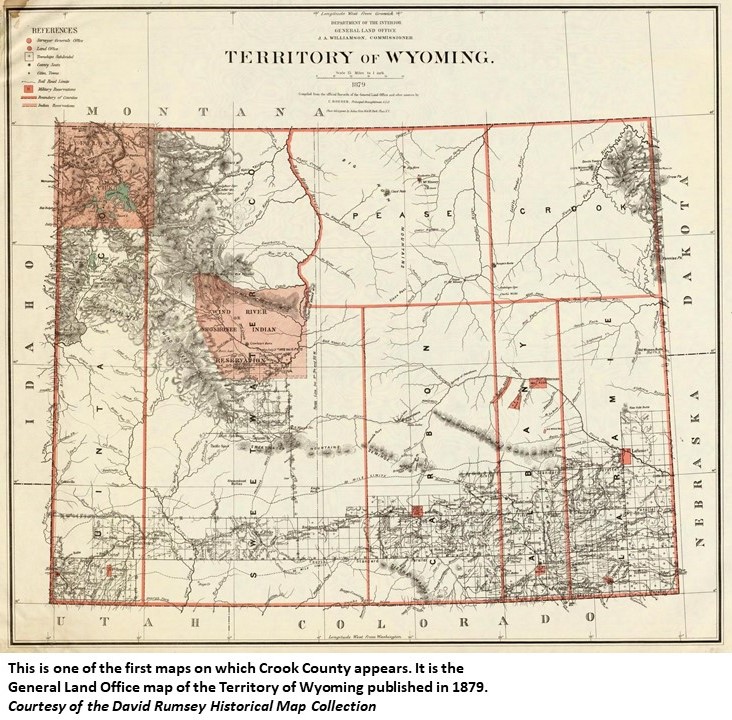 Named for General George H. Crook, the Indian fighter. (Gannett, 1905) Named for General George Crook, of the United States Army, who crushed the Indians of the Northwest, after the defeat and death of General Custer, at their hands. Organized in 1875. County Seat is in Sundance. (WPA)
