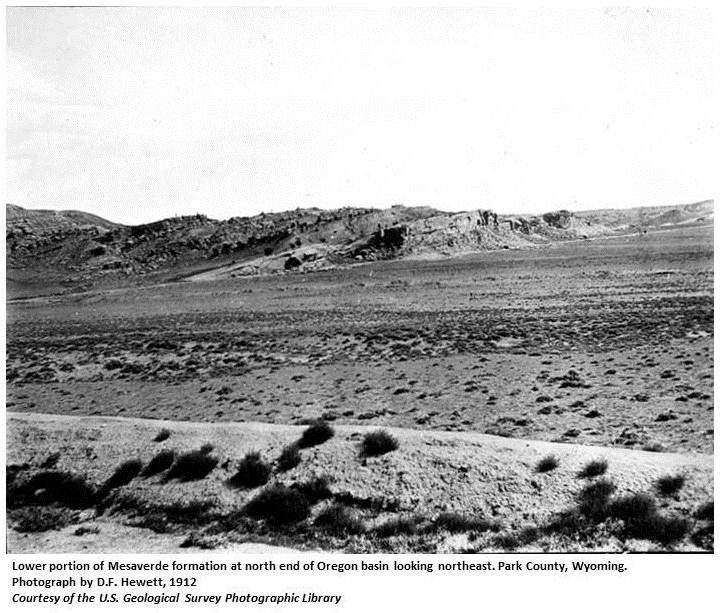 According to early cowboys, an old dogie bull became obstreperous as the Carter herd was crossing this area, and was left to die. In the spring a round-up wagon found the bull in good health and utterly indifferent to his solitude at no great distance from the spot where he had been abandoned. He was an Oregon bull so his winter range was called Oregon Basin. (WPA)