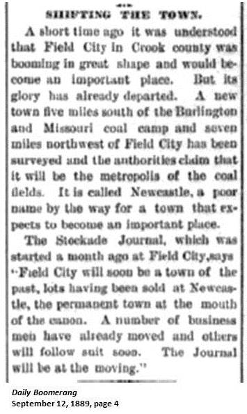 Named for "Newcastle on the tyne," great coal port and industrial city of England, by Mr. Hemingway, who was first superintendent of Cambria Coal Mine. (WPA) Newcastle ... named for the great English coal port, Newcastle-upon-Tyne, proudly calls itself the "Western Gateway to the Black Hills." (Wyoming Guide)