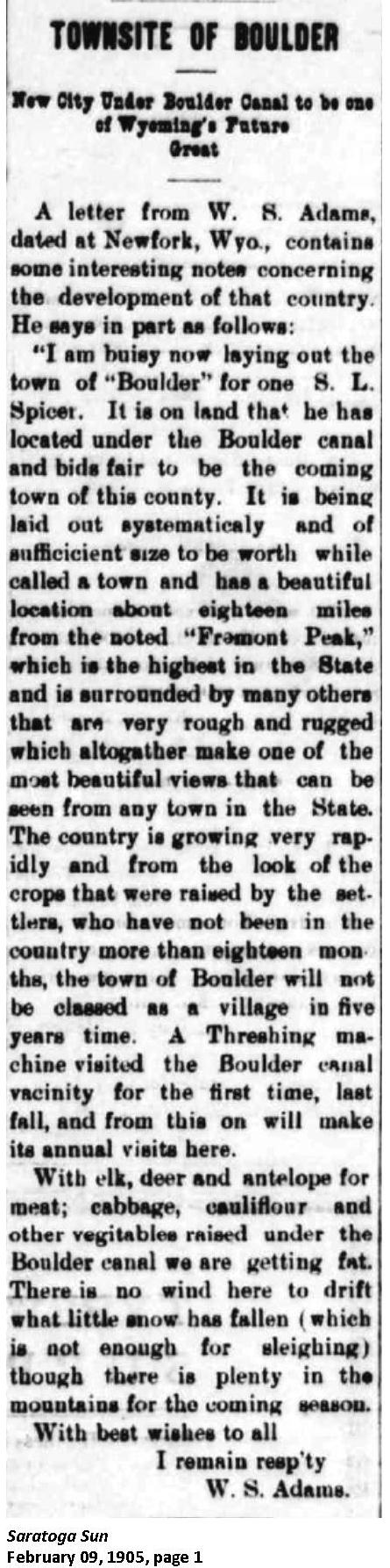 Area in Sublette County known for ranching. Takes its name from Boulder Lake. (WPA) The post office was located on the east side of Boulder Creek. (Wyoming Post Offices)