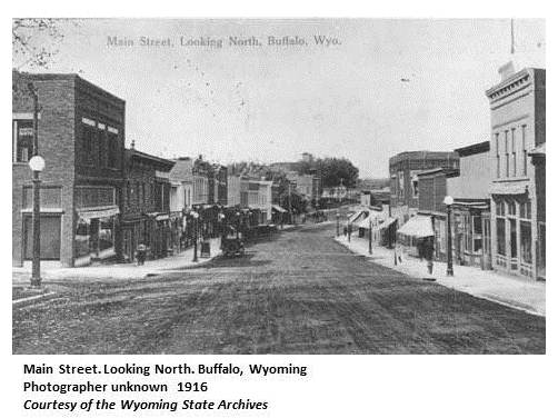 The town of Buffalo is situated north of the center of the county, on Clear Creek, near the Big Horn Mountains. It was founded in 1882 and incorporated by act of the Wyoming Legislature in 1884. When the time came to name this town, several names were placed in a hat, and one was drawn. "Buffalo" was the name suggested by William Hart in honor of his hometown Buffalo, New York. For many years Buffalo claimed to be the largest town in the United States without a railroad, but in February 1918 the first train arrived over the Wyoming Railroad which connected with the Chicago, Burlington and Quincy railroad at Clearmont in Sheridan County. Work on this line began in 1914. The town has a unique winding main street, which was laid out in early days following the contour of a gulch running north and south through town. Clear Creek crosses this main street east and west and is entirely covered by the street surfacing, being seen on either side as it flows under and emerges from the street. (WPA) Located on virgin buffalo grounds which were claimed by the Indians. (Annals of Wyoming 14:2) One version of the origin of this name was presented in the Annals of Wyoming for April 1942. Two other versions are given in Bartlett's History of Wyoming. The first states that the name was given by Alvin J. McCray who was born in Buffalo, New York. The second story states that several houses had been erected before a name was selected. Each man wrote his choice on a slip of paper, deposited it in a hat, and the name Buffalo was drawn. William Hart, a native of Buffalo, New York, claimed he deposited that slip in the hat. (Annals 14:3)