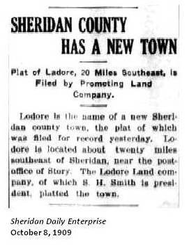 The town was established by the Lodore Land Company, which was incorporated in Wyoming on April 21, 1908 with S. H. Smith as president. (Sheridan Enterprise, May 1, 1908 and October 8, 1909)