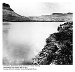 | Flaming Gorge was named by John Wesley Powell on his first expedition down the Green River in 1869. "The river is running to the south; the mountains have an easterly and westerly trend directly athwart its course, yet it glides on in a quiet way as if it thought a mountain range no formidable obstruction to its course. It enters the range by a flaring, brilliant, red gorge, that may be seen from the north a score of miles away. The great mass of the mountain-ridge through which the gorge is cut is composed of bright vermilion rocks; but they are surmounted by broad bands of mottled buff and gray, and these bands come down with a gentle curve to the water's edge on the nearer slope of the mountain. This is the head of the first canon we are about to explore—an introductory one to a series made by the river through this range. We name it Flaming Gorge. The cliffs or walls we find, on measurement, to be about one thousand two hundred feet high." (Powell, 1875) |