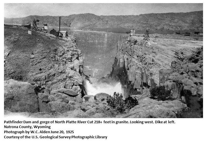 | The system was named "Pathfinder" in honor of General John C. Fremont, the great explorer, who made the Platte valley, in what is now Wyoming, the scene of his most interesting travels and investigations, and it was at about where the dam is located that Fremont's boats capsized. The Astorians gave this canyon the name of "Fiery Narrows." (WPA) "In the spring of 1903, general plans for storage of water and irrigation from North Platte River, based on the surveys and investigations then made, were prepared. The plans as outlined in a letter by the Director of the Geological Survey to the Secretary of the Interior, dated March 7, 1903, included the storing of water in a reservoir on Sweetwater River and irrigation of lands along the North Platte River. It was recommended that development of the general project as outlined be approved, that the examination of irrigable lands, reservoirs, etc., be continued, and that work be carried on in greater detail for the ascertainment of facts necessary for the preparation of specifications and the letting of contracts for the construction of irrigation works. On March 14, 1903, the Secretary of the Interior approved the general project as recommended and authorized the preparation of plans and specifications for construction to be submitted to him for approval. In 1904 recommendations were made for the construction of a reservoir on the North Platte River below the mouth of Sweetwater River in place of the reservoir first proposed on the Sweetwater River. The reservoir selected received the name of "Pathfinder" on account of a tradition that General John C. Fremont, popularly known as the "Pathfinder," passed through the canyon at the reservoir site on one of his exploring expeditions. Contingent on favorable reports on details of construction and of lands proposed to be reclaimed, authority for the construction of a dam at the Pathfinder site was granted by the Secretary of the Interior on May 3, 1904." (Annual Report, 1909-1910, Reclamation Service) "The Pathfinder Dam is built of granite random rubble masonry with coursed rubble faces. It is curved to a radius of 150 feet, has a total length of 432 feet, a height of 218 feet above lowest foundation, a top width of 10 feet, an up-stream batter of 15 per cent and a down-stream batter of 25 per cent. It is located about 3 miles below the junction of the North Platte and Sweetwater Rivers, where the canyon is about 90 feet wide at the bottom and 200 feet wide at the top, the sides for the upper 75 feet being nearly vertical. The depth from the top of the canyon to bedrock in the foundation is about 200 feet. Above this canyon the valleys of both streams widen out and form a reservoir site of large capacity. The site is called the "Pathfinder," on account of a tradition that Gen. John C. Fremont, popularly known as "The Pathfinder," passed through this canyon on one of his exploring trips." (Arthur Powell Davis in "Irrigation works constructed by the United States Government," 1917) |