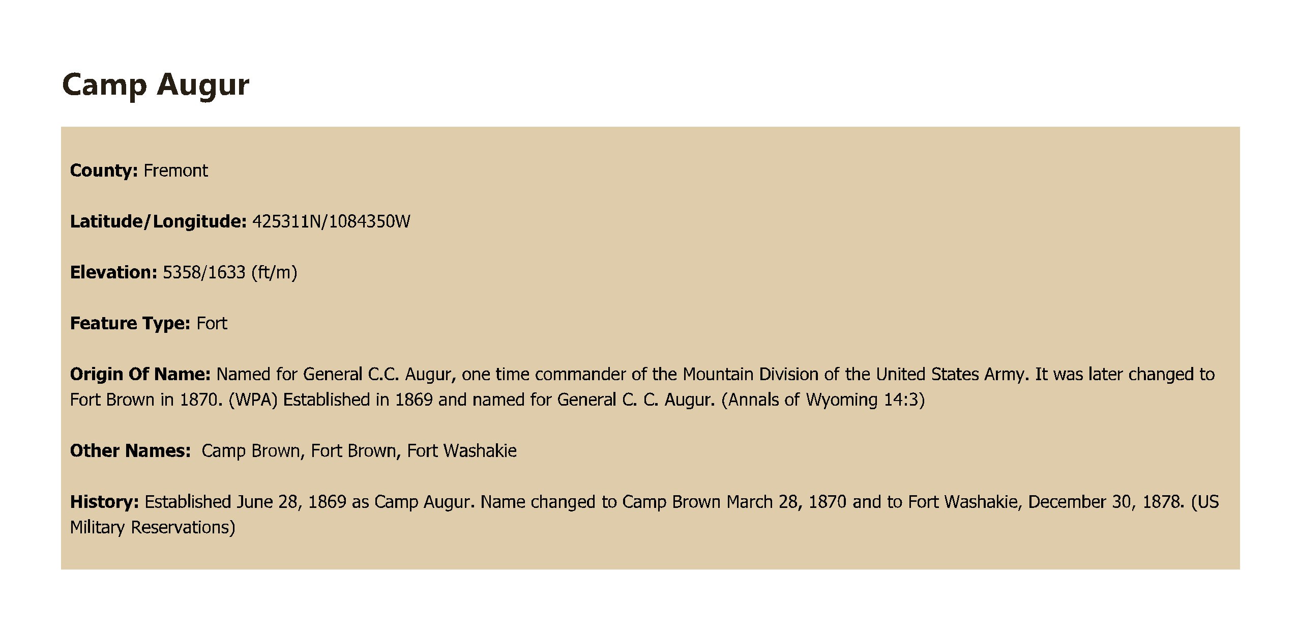 Named for General C.C. Augur, one time commander of the Mountain Division of the United States Army. It was later changed to Fort Brown in 1870. (WPA) Established in 1869 and named for General C. C. Augur. (Annals of Wyoming 14:3)