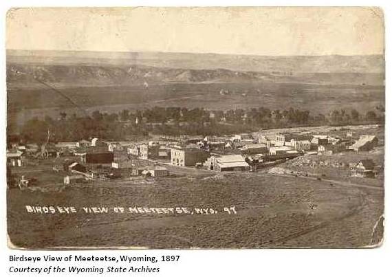 Named by Captain Jones. Originates from a Shoshone name meaning "near by". Name originally given to a tributary of the Shoshone River, but this was later changed to Dry Creek. Meeteetse was then given to the stream running into the Greybull River. The town eventually took the name from the creek. (WPA) This is supposed to be an Indian word meaning "place of rest" some say it means "far away." (Annals of Wyoming 14:3)