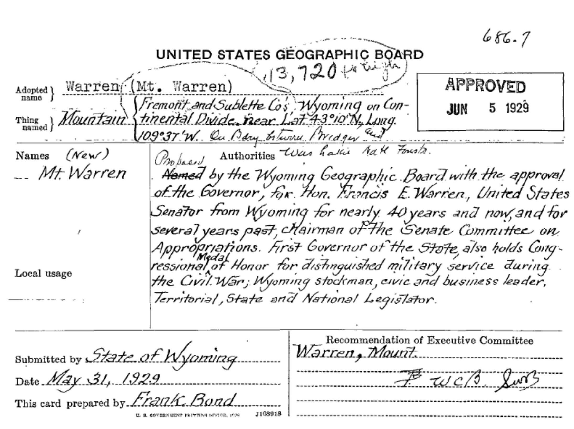 | Mountain, altitude 13,720 feet, Fremont and Sublette Counties, Wyoming, on Continental Divide, ... on boundary between Bridger and Washakie National Forests. Name proposed by the Wyoming Geographic Board for Hon. Francis E. Warren, United States Senator from Wyoming for nearly 40 years and who was also first governor of the state. (Decisions, 1929) Named for the late Hon. Francis E. Warren, United States Senator from Wyoming for nearly 40 years and the first governor of the state, member of the G.A.R., and a holder of the Congressional Medal of Honor. (WPA) |