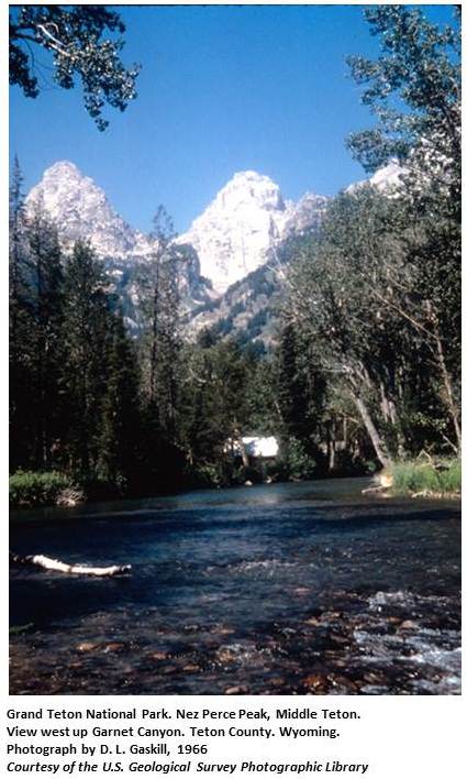 Peak, altitude 11,700 feet, Grand Teton National Park, Teton County ... . Named for well-known Indian tribe which at the beginning of the last century occupied the surrounding territory. (Decisions, 1931) Approximately 11,800 feet in height, Nez Perce is located on the eastern front of the Teton Range. It is often mistaken for the South Teton Peak which lies behind the former. Nez Perce was named after the Nez Perce Indians. The name means "pierced noses." These Indians, however, did not pierce there noses so the name must have been adopted by them or applied to them by the white men. The name of Nez Perce is one of the few geographic names in the Jackson Hole Region that was taken from the Indians. This mountain was formally called "Mitten Mountain." The latter name was applied because formations on the south side of the peak resembled a hand, or so it was thought. Nez Perce may easily be recognized from its resemblance to the snout of a howling wolf thrust upward into the air. (WPA)
