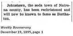 Center of a soda mining camp. Machinery installed by the Syndicate Improvement Company in 1892 and abandoned April 20, 1894. Name was changed to Berthaton in 1896 by Barns (of the Barns school books) in honor of his daughter Bertha. (WPA)