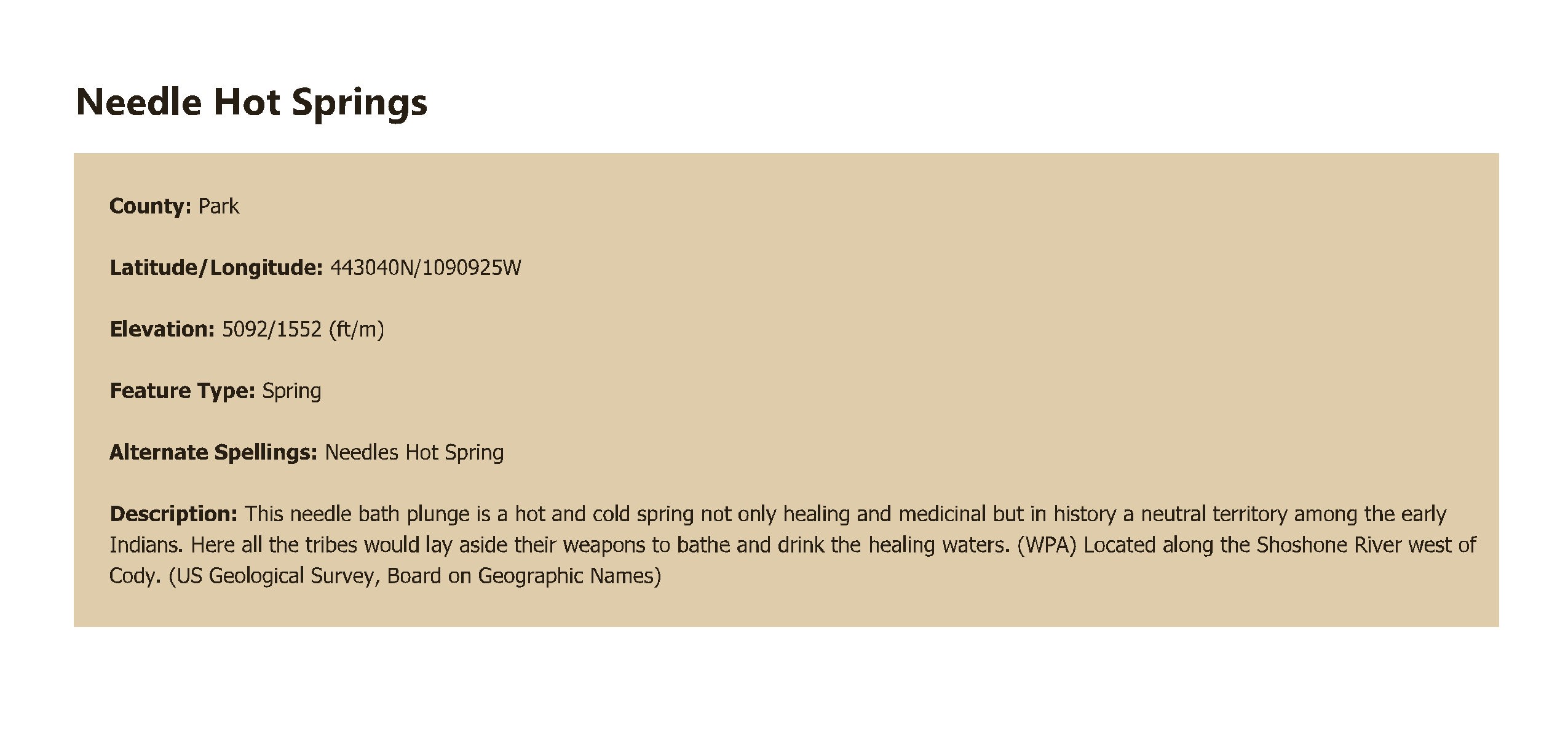 Origin Of Name:This needle bath plunge is a hot and cold spring not only healing and medicinal but in history a neutral territory among the early Indians. Here all the tribes would lay aside their weapons to bathe and drink the healing waters. (WPA)