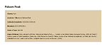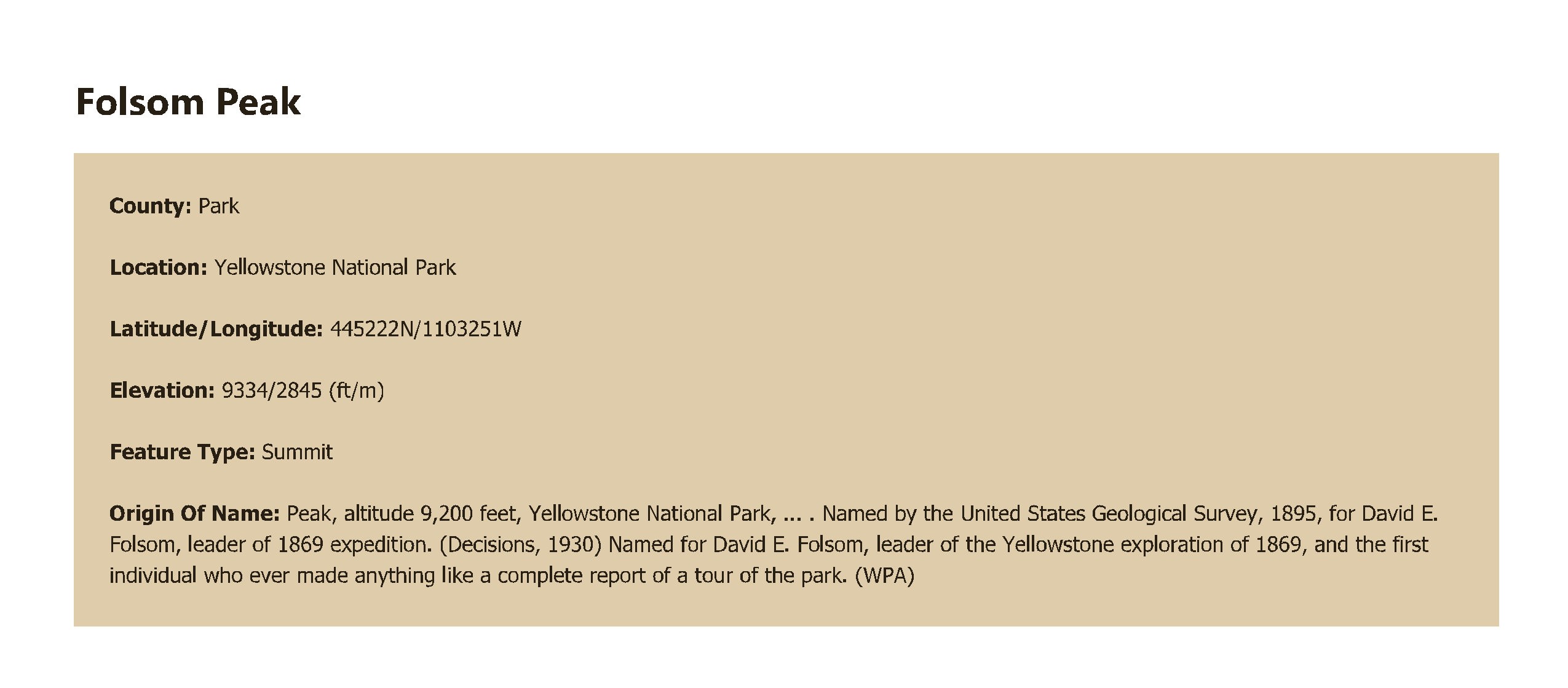 | Peak, altitude 9,200 feet, Yellowstone National Park, ... . Named by the United States Geological Survey, 1895, for David E. Folsom, leader of 1869 expedition. (Decisions, 1930) Named for David E. Folsom, leader of the Yellowstone exploration of 1869, and the first individual who ever made anything like a complete report of a tour of the park. (WPA) |