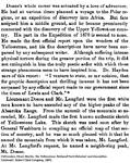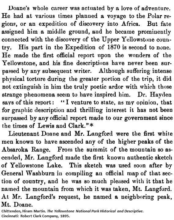 | The name refers to the long history of Native peoples in the Yellowstone area, as well as those killed in conflicts with settlers and the military during the 1800s. (USGS, 2022) Mount in Yellowstone Park, named for Lieut. Gustavus C. Doane, United States Army, who commanded the military escort of an expedition in 1870. (Gannett, 1905) Mountain, altitude 10,500 feet, Yellowstone National Park, ... . Named by the Washburn party, 1870, for Lieut. G. C. Doane, commander of the military escort of this expedition, who made the first official report upon the wonders of the Yellowstone region. (Decisions, 1930) |